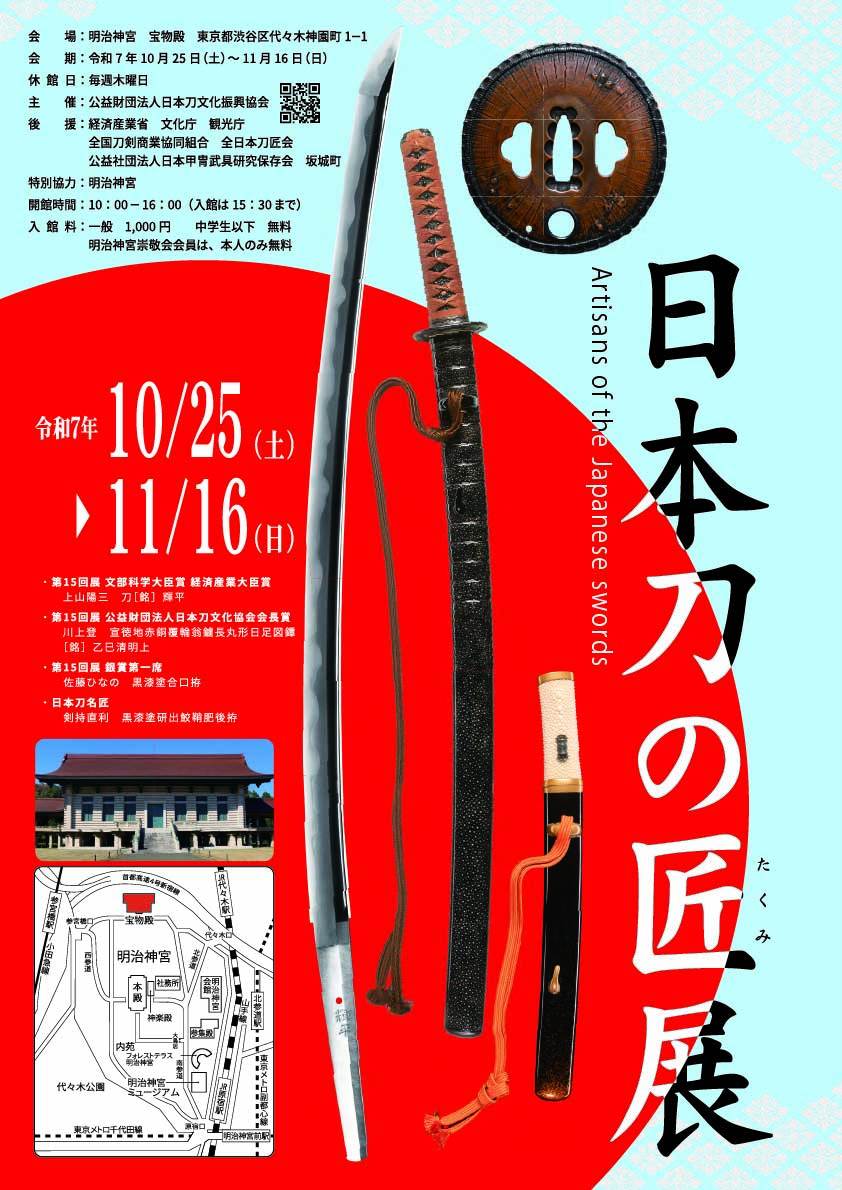 技の会会員の「JAP工房」 川上登さんが、日本刀文化振興協会会長賞を受賞いたしました! 2025年5月 明治神宮 宝物殿(春と秋の特別な時期にしか入れない、国の重要文化財です) 「日本刀の匠展」 にて展示中10月25日(土)~11月16日(日)10:00~16:00入場 1000円毎週木曜休館